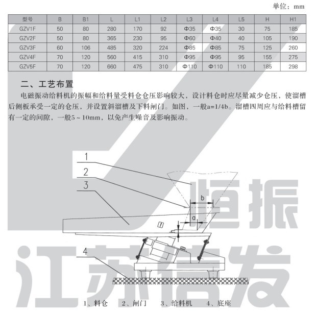 電磁振動(dòng)給料機(jī)的振幅和給料量受料倉(cāng)倉(cāng)壓影響較大,設(shè)計(jì)料倉(cāng)時(shí)應(yīng)盡量減少倉(cāng)壓,使溜咀后側(cè)板承受一定的倉(cāng)壓,并設(shè)置斜溜沮及下料閘門(mén)。如圖,一般a=1/4b。溜咀四周應(yīng)與給料槽留有一定的間隙,一般5~10mm,以免產(chǎn)生噪音及影響振動(dòng)。